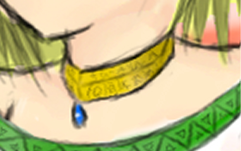 この絵でエアシスのしている首飾り、幾何学模様みたいなのを入れたかったんだけど、イマイチうまく描けなかったので「ちびきりんへ 10周年おめ!」と薄く書いて縮小して誤魔化したのはここだけの話。